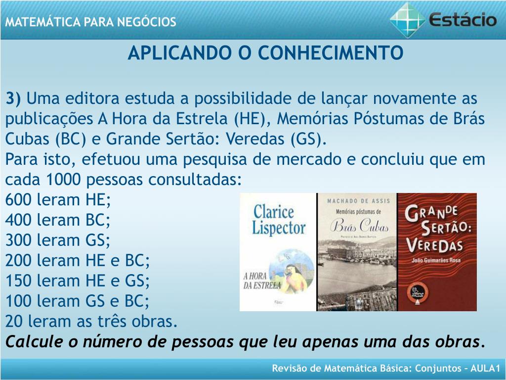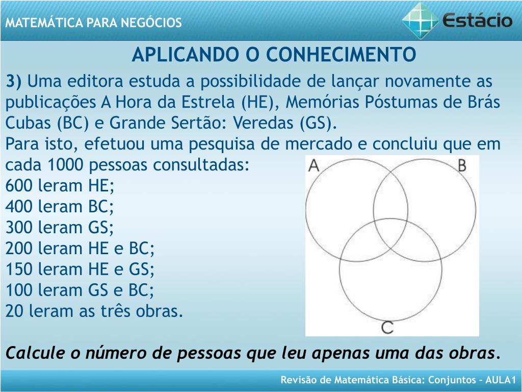 APLICANDO O CONHECIMENTO 3) Uma editora estuda a possibilidade de lançar novamente as publicações A Hora da Estrela (HE), Memórias Póstumas de Brás Cubas (BC) e Grande Sertão: Veredas (GS). Para isto, efetuou uma pesquisa de mercado e concluiu que em cada 1000 pessoas consultadas: 600 leram HE; 400 leram BC; 300 leram GS; 200 leram HE e BC; 150 leram HE e GS; 100 leram GS e BC; 20 leram as três obras. Calcule o número de pessoas que leu apenas uma das obras.