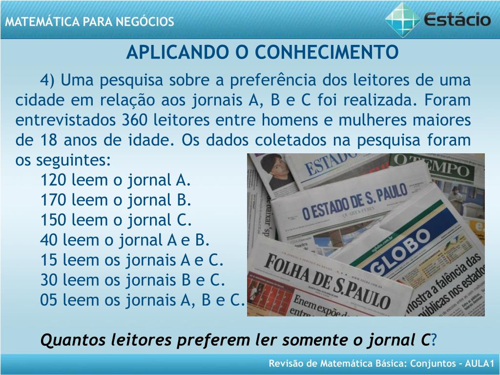 APLICANDO O CONHECIMENTO 4) Uma pesquisa sobre a preferência dos leitores de uma cidade em relação aos jornais A, B e C foi realizada. Foram entrevistados 360 leitores entre homens e mulheres maiores de 18 anos de idade. Os dados coletados na pesquisa foram os seguintes: 120 leem o jornal A. 170 leem o jornal B. 150 leem o jornal C. 40 leem o jornal A e B. 15 leem os jornais A e C. 30 leem os jornais B e C. 05 leem os jornais A, B e C. 110 preferem ler somente o jornal C; 70 preferem ler somente o jornal A e 105 preferem ler somente o jornal B.