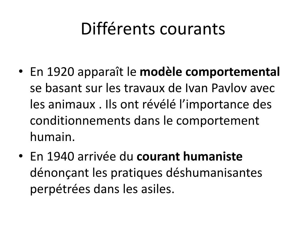 Différents courants • En 1920 apparaît le modèle comportemental se basant sur les travaux de Ivan Pavlov avec les animaux . Ils ont révélé l’importance des conditionnements dans le comportement humain. • En 1940 arrivée du courant humaniste dénonçant les pratiques déshumanisantes perpétrées dans les asiles.