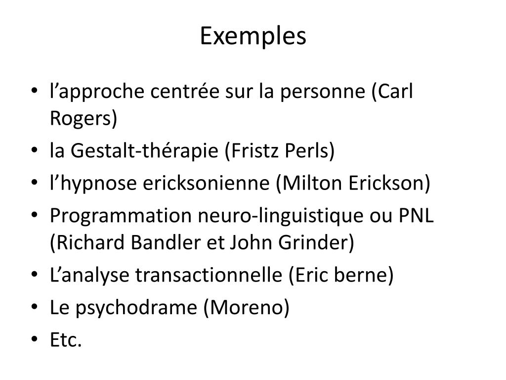 Exemples • l’approche centrée sur la personne (Carl Rogers) • la Gestalt-thérapie (Fristz Perls) • l’hypnose ericksonienne (Milton Erickson) • Programmation neuro-linguistique ou PNL (Richard Bandler et John Grinder) • L’analyse transactionnelle (Eric berne) • Le psychodrame (Moreno) • Etc.