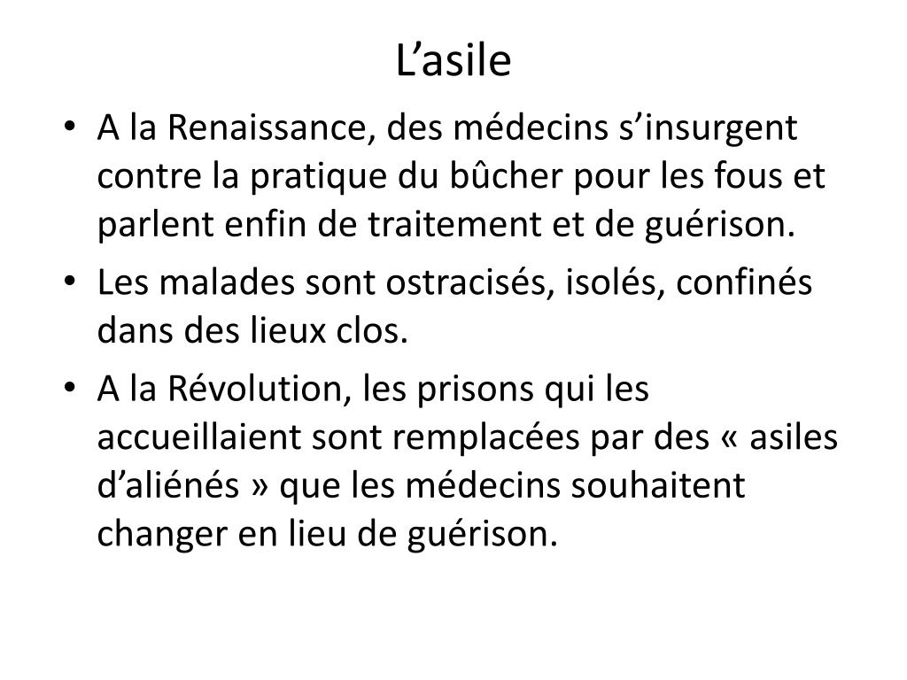 L’asile • A la Renaissance, des médecins s’insurgent contre la pratique du bûcher pour les fous et parlent enfin de traitement et de guérison. • Les malades sont ostracisés, isolés, confinés dans des lieux clos. • A la Révolution, les prisons qui les accueillaient sont remplacées par des « asiles d’aliénés » que les médecins souhaitent changer en lieu de guérison.