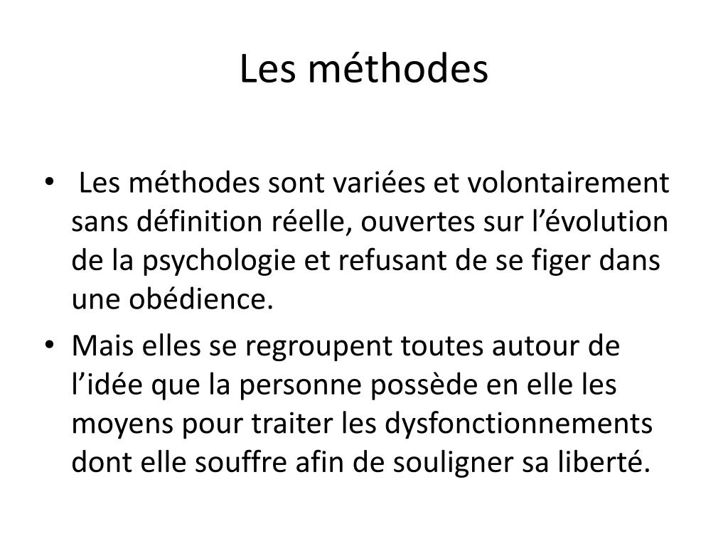 Les méthodes • Les méthodes sont variées et volontairement sans définition réelle, ouvertes sur l’évolution de la psychologie et refusant de se figer dans une obédience. • Mais elles se regroupent toutes autour de l’idée que la personne possède en elle les moyens pour traiter les dysfonctionnements dont elle souffre afin de souligner sa liberté.