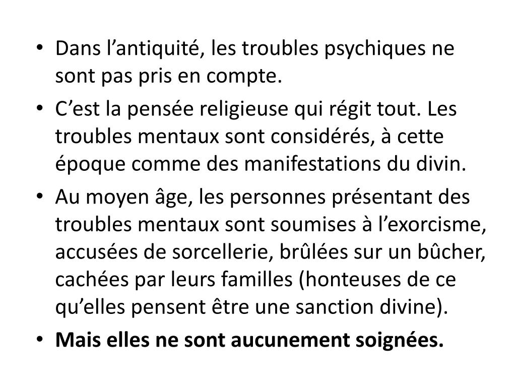 Dans l’antiquité, les troubles psychiques ne sont pas pris en compte. • C’est la pensée religieuse qui régit tout. Les troubles mentaux sont considérés, à cette époque comme des manifestations du divin. • Au moyen âge, les personnes présentant des troubles mentaux sont soumises à l’exorcisme, accusées de sorcellerie, brûlées sur un bûcher, cachées par leurs familles (honteuses de ce qu’elles pensent être une sanction divine). • Mais elles ne sont aucunement soignées.