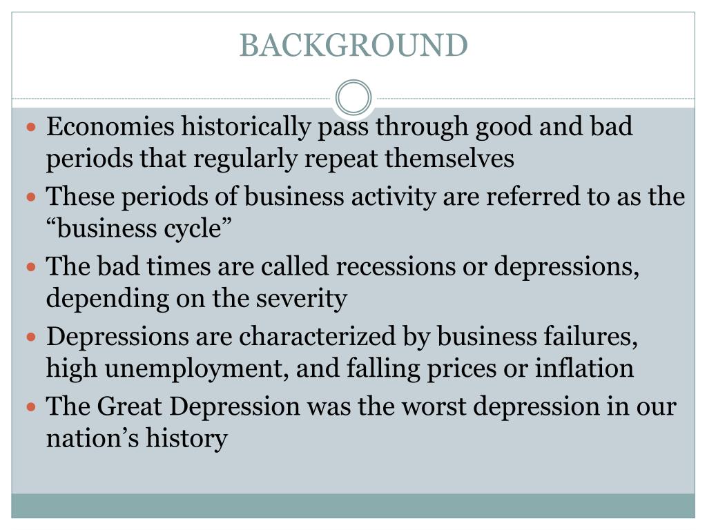 BACKGROUND Economies historically pass through good and bad periods that regularly repeat themselves These periods of business activity are referred to as the “business cycle” The bad times are called recessions or depressions, depending on the severity Depressions are characterized by business failures, high unemployment, and falling prices or inflation The Great Depression was the worst depression in our nation’s history