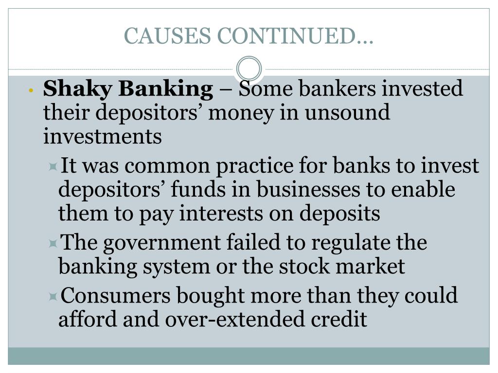 CAUSES CONTINUED… • Shaky Banking – Some bankers invested their depositors’ money in unsound investments • It was common practice for banks to invest depositors’ funds in businesses to enable them to pay interests on deposits • The government failed to regulate the banking system or the stock market • Consumers bought more than they could afford and over-extended credit