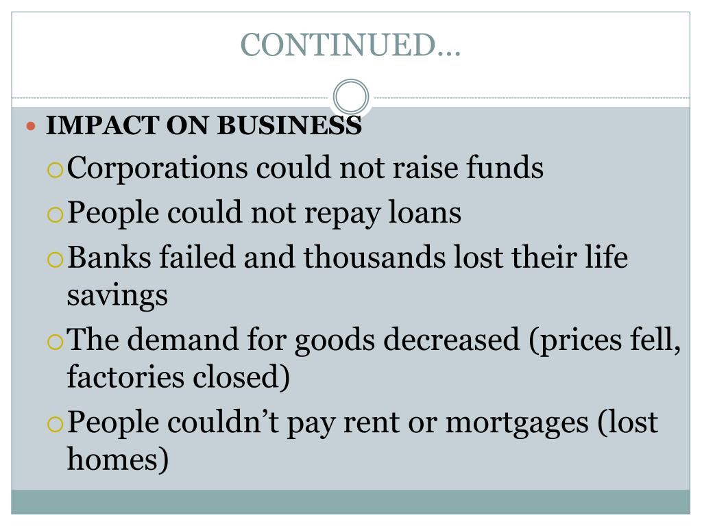 CONTINUED… • IMPACT ON BUSINESS • Corporations could not raise funds • People could not repay loans • Banks failed and thousands lost their life savings • The demand for goods decreased (prices fell, factories closed) • People couldn’t pay rent or mortgages (lost homes)