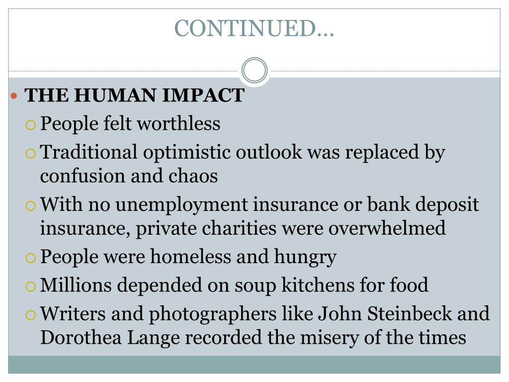 CONTINUED… • THE HUMAN IMPACT • People felt worthless • Traditional optimistic outlook was replaced by confusion and chaos • With no unemployment insurance or bank deposit insurance, private charities were overwhelmed • People were homeless and hungry • Millions depended on soup kitchens for food • Writers and photographers like John Steinbeck and Dorothea Lange recorded the misery of the times