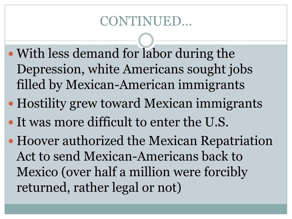 CONTINUED… With less demand for labor during the Depression, white Americans sought jobs filled by Mexican-American immigrants Hostility grew toward Mexican immigrants It was more difficult to enter the U.S. Hoover authorized the Mexican Repatriation Act to send Mexican-Americans back to Mexico (over half a million were forcibly returned, rather legal or not)