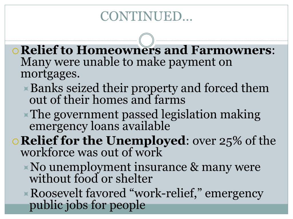 CONTINUED… • Relief to Homeowners and Farmowners: Many were unable to make payment on mortgages. • Banks seized their property and forced them out of their homes and farms • The government passed legislation making emergency loans available • Relief for the Unemployed: over 25% of the workforce was out of work • No unemployment insurance & many were without food or shelter • Roosevelt favored “work-relief,” emergency public jobs for people