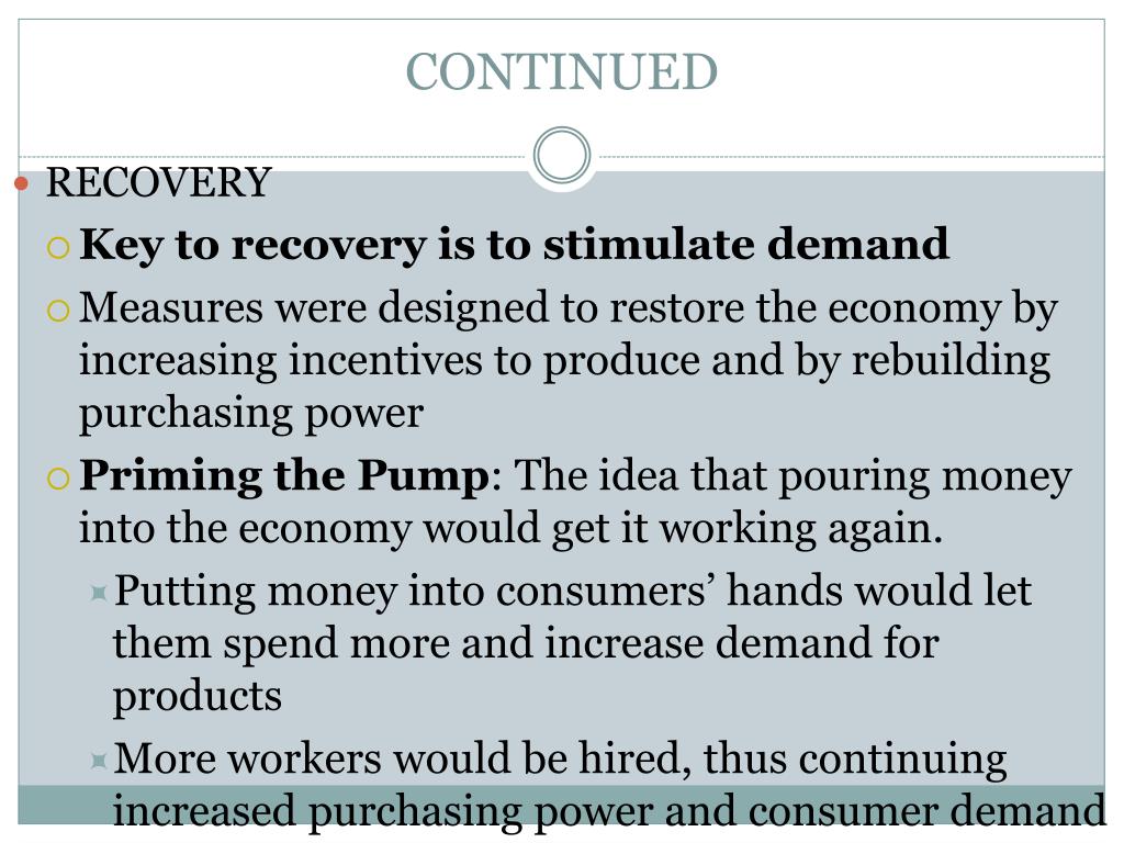 CONTINUED • RECOVERY • Key to recovery is to stimulate demand • Measures were designed to restore the economy by increasing incentives to produce and by rebuilding purchasing power • Priming the Pump: The idea that pouring money into the economy would get it working again. • Putting money into consumers’ hands would let them spend more and increase demand for products • More workers would be hired, thus continuing increased purchasing power and consumer demand