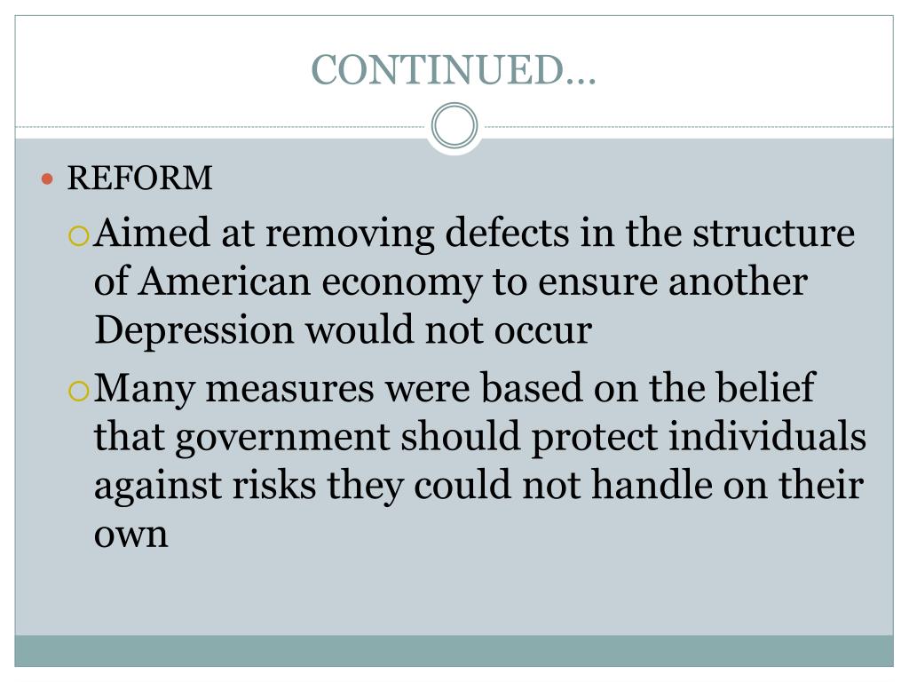 CONTINUED… • REFORM • Aimed at removing defects in the structure of American economy to ensure another Depression would not occur • Many measures were based on the belief that government should protect individuals against risks they could not handle on their own