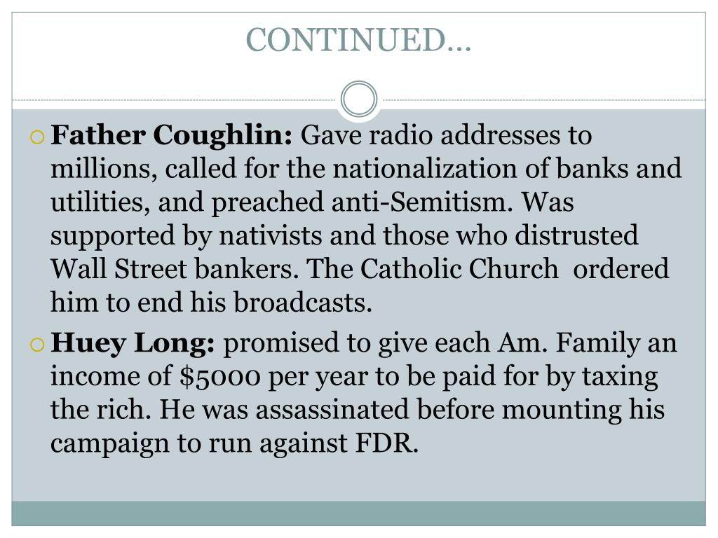 CONTINUED… • Father Coughlin: Gave radio addresses to millions, called for the nationalization of banks and utilities, and preached anti-Semitism. Was supported by nativists and those who distrusted Wall Street bankers. The Catholic Church ordered him to end his broadcasts. • Huey Long: promised to give each Am. Family an income of $5000 per year to be paid for by taxing the rich. He was assassinated before mounting his campaign to run against FDR.