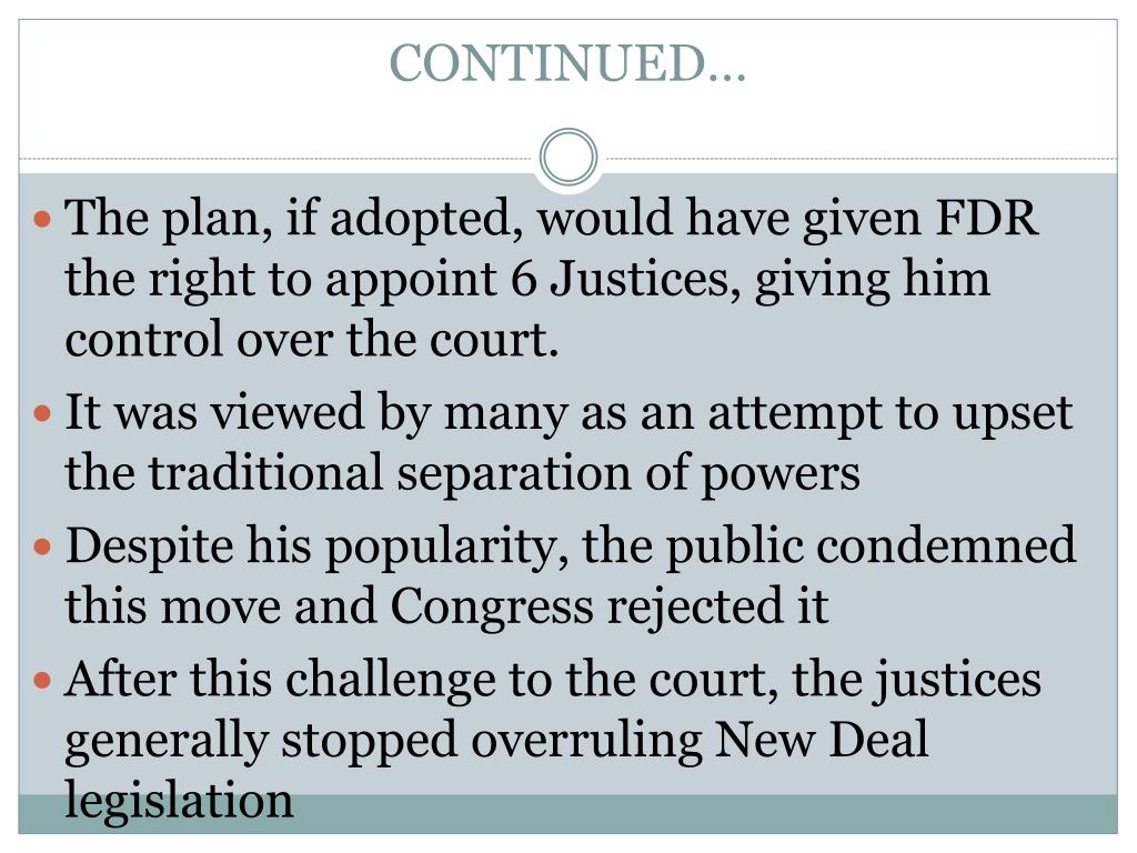 CONTINUED… The plan, if adopted, would have given FDR the right to appoint 6 Justices, giving him control over the court. It was viewed by many as an attempt to upset the traditional separation of powers Despite his popularity, the public condemned this move and Congress rejected it After this challenge to the court, the justices generally stopped overruling New Deal legislation