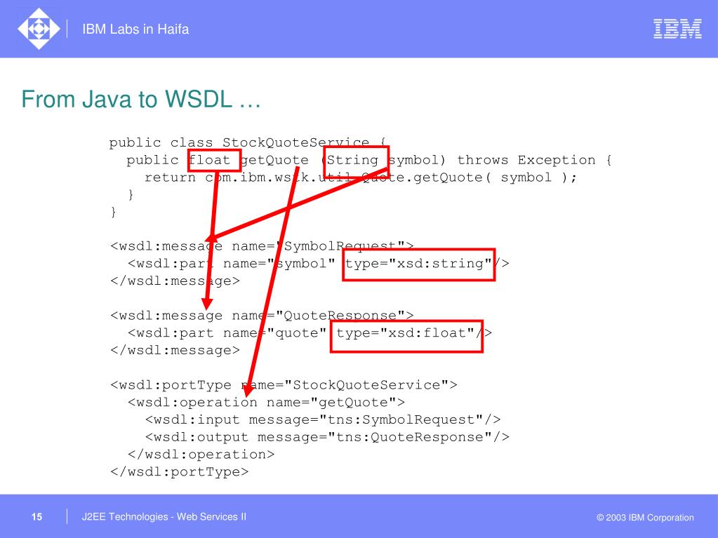 From Java to WSDL … public class StockQuoteService { public float getQuote (String symbol) throws Exception { return com.ibm.wstk.util.Quote.getQuote( symbol ); } } <wsdl:message name="SymbolRequest"> <wsdl:part name="symbol" type="xsd:string"/> </wsdl:message> <wsdl:message name="QuoteResponse"> <wsdl:part name="quote" type="xsd:float"/> </wsdl:message> <wsdl:portType name="StockQuoteService"> <wsdl:operation name="getQuote"> <wsdl:input message="tns:SymbolRequest"/> <wsdl:output message="tns:QuoteResponse"/> </wsdl:operation> </wsdl:portType>