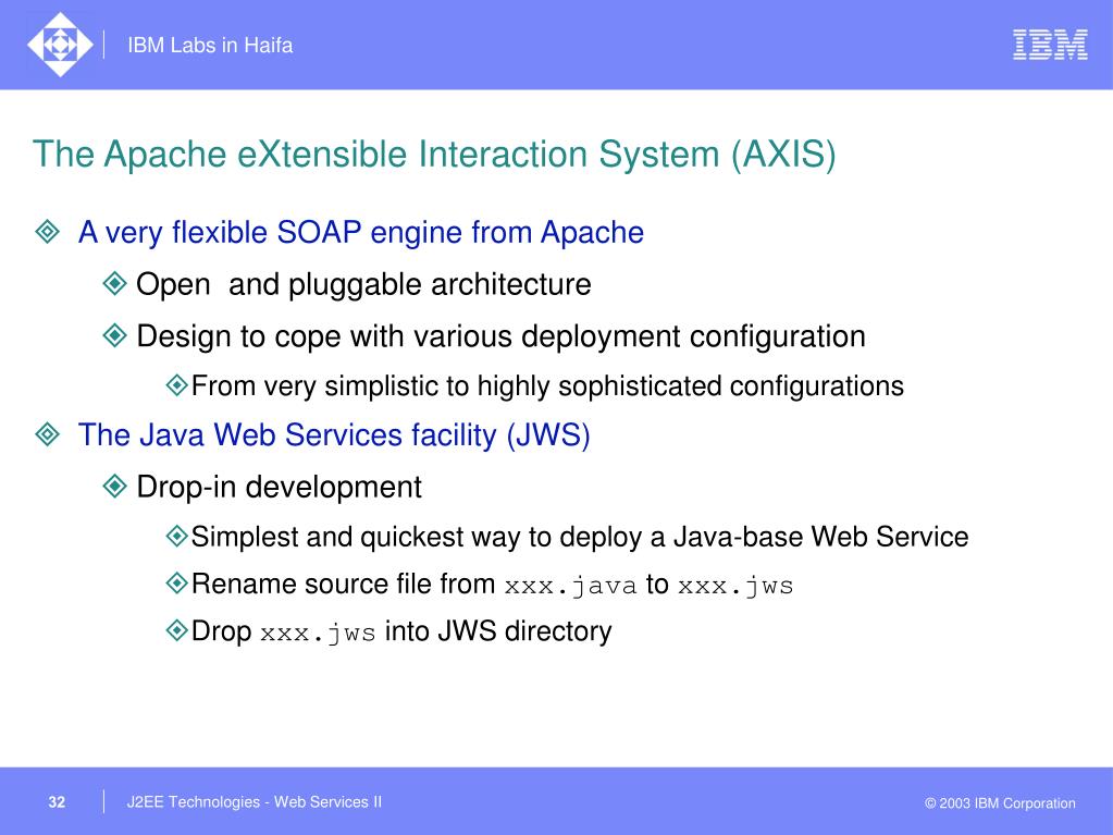 The Apache eXtensible Interaction System (AXIS) • A very flexible SOAP engine from Apache • Open and pluggable architecture • Design to cope with various deployment configuration • From very simplistic to highly sophisticated configurations • The Java Web Services facility (JWS) • Drop-in development • Simplest and quickest way to deploy a Java-base Web Service • Rename source file from xxx.java to xxx.jws • Drop xxx.jws into JWS directory