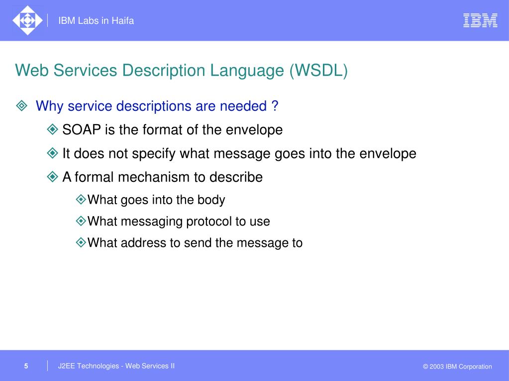 Web Services Description Language (WSDL) • Why service descriptions are needed ? • SOAP is the format of the envelope • It does not specify what message goes into the envelope • A formal mechanism to describe • What goes into the body • What messaging protocol to use • What address to send the message to