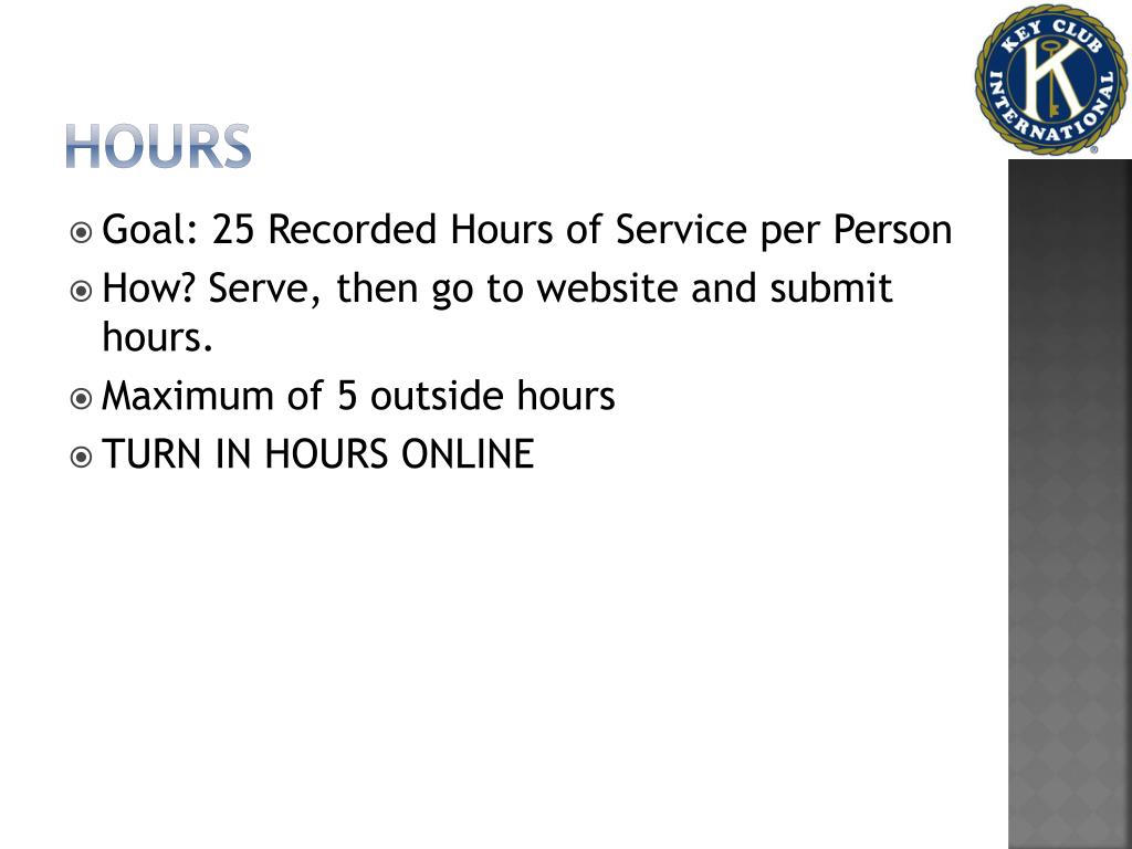 Hours • Goal: 25 Recorded Hours of Service per Person • How? Serve, then go to website and submit hours. • Maximum of 5 outside hours • TURN IN HOURS ONLINE