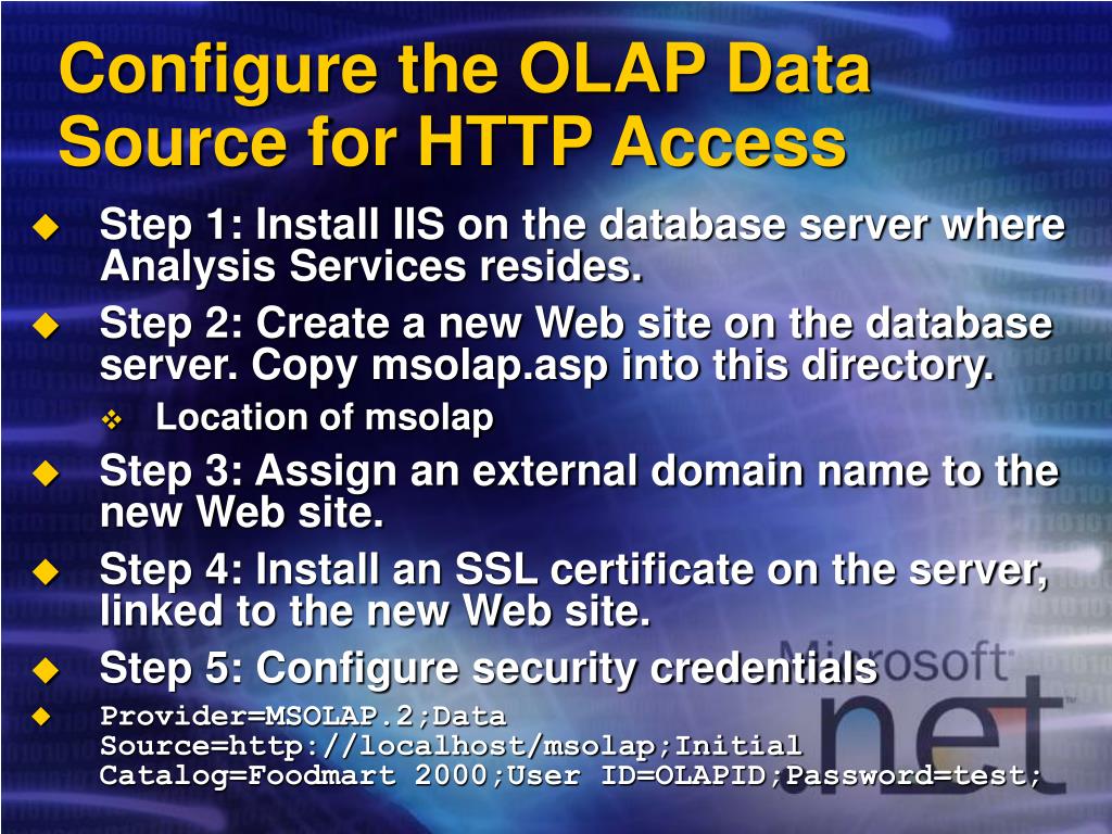 Configure the OLAP Data Source for HTTP Access • Step 1: Install IIS on the database server where Analysis Services resides. • Step 2: Create a new Web site on the database server. Copy msolap.asp into this directory. • Location of msolap • Step 3: Assign an external domain name to the new Web site. • Step 4: Install an SSL certificate on the server, linked to the new Web site. • Step 5: Configure security credentials • Provider=MSOLAP.2;Data Source=http://localhost/msolap;Initial Catalog=Foodmart 2000;User ID=OLAPID;Password=test;