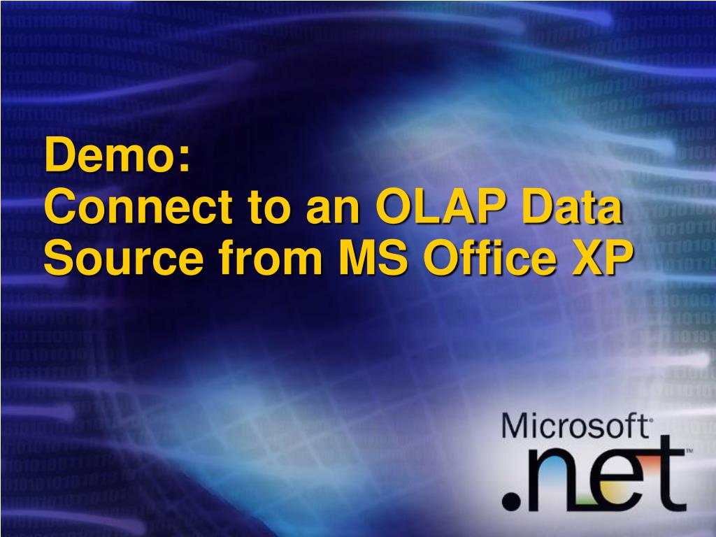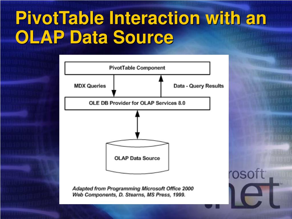 References • Analysis Services Overview: • MSDN Library > SQL Server 2000 > SDK Documentation > Analysis Services • Microsoft MMC/Analysis service Help • KB Article 279489: How to Connect to Analysis Server 2000 by Using HTTP Connection • Microsoft Office Solutions Articles: Pivoting Tables, Parts I and II by David Stearns • Office Solutions Development > Microsoft Office > Microsoft Office (General) > Periodicals > Microsoft Office Solutions 2002 • Introduction to Multidimensional Expressions (MDX) • MSDN Library > Data Access > OLAP Services • Newsgroup: • microsoft.public.office.developer.web.components