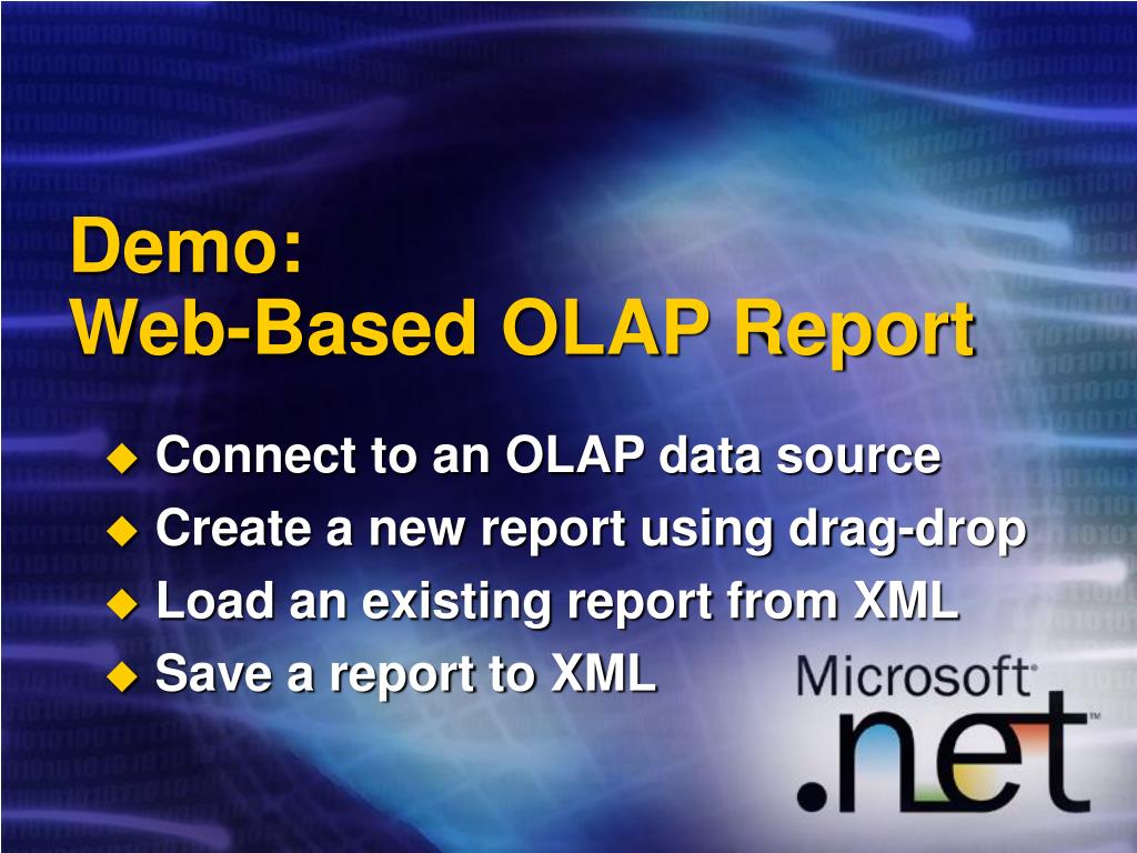 Demo:Web-Based OLAP Report Connect to an OLAP data source Create a new report using drag-drop Load an existing report from XML Save a report to XML
