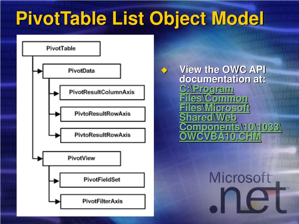 PivotTable List Object Model • View the OWC API documentation at: C:\Program Files\Common Files\Microsoft Shared\Web Components\10\1033\OWCVBA10.CHM
