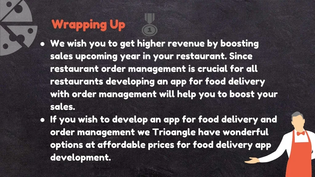 Wrapping Up • We wish you to get higher revenue by boosting sales upcoming year in your restaurant. Since restaurant order management is crucial for all restaurants developing an app for food delivery with order management will help you to boost your sales. • If you wish to develop an app for food delivery and order management we Trioangle have wonderful options at affordable prices for food delivery app development.