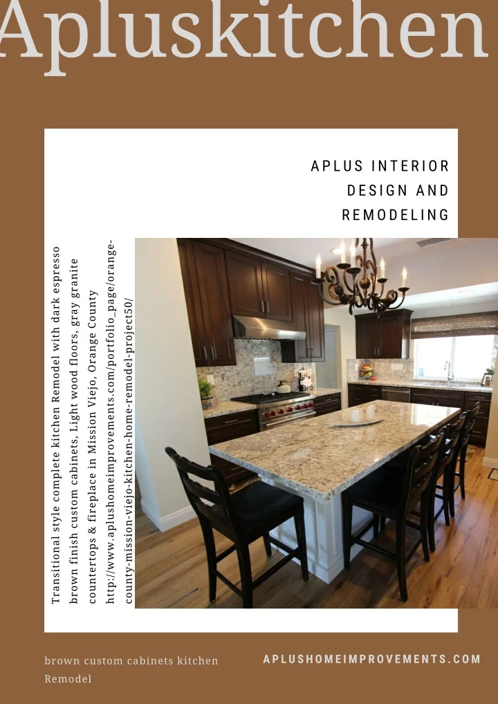 Apluskitchen APLUS INTERIOR DESIGN AND REMODELING http://www.aplushomeimprovements.com/portfolio_page/orange- Transitional style complete kitchen Remodel with dark espresso brown finish custom cabinets, Light wood floors, gray granite countertops & fireplace in Mission Viejo, Orange County county-mission-viejo-kitchen-home-remodel-project50/ APLUSHOMEIMPROVEMENTS.COM brown custom cabinets kitchen Remodel