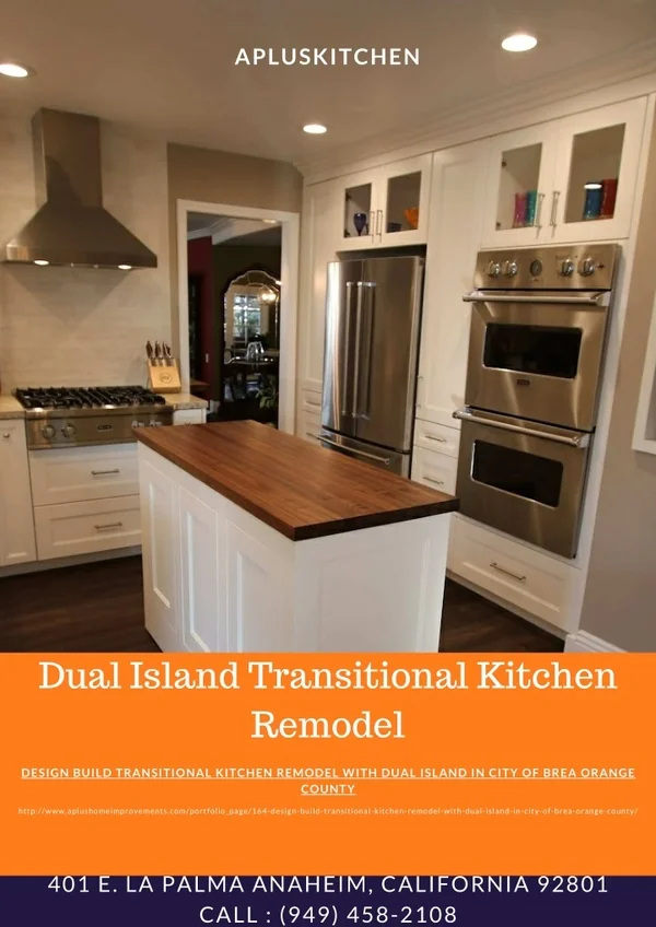 1. APLUSKITCHEN Dual Island Transitional Kitchen Remodel DESIGN BUILD TRANSITIONAL KITCHEN REMODEL WITH DUAL ISLAND IN CITY OF BREA ORANGE COUNTY http://www.aplushomeimprovements.com/portfolio_page/164-design-build-transitional-kitchen-remodel-with-dual-island-in-city-of-brea-orange-county/ 401 E. LA PALMA ANAHEIM, CALIFORNIA 92801 CALL : (949) 458-2108