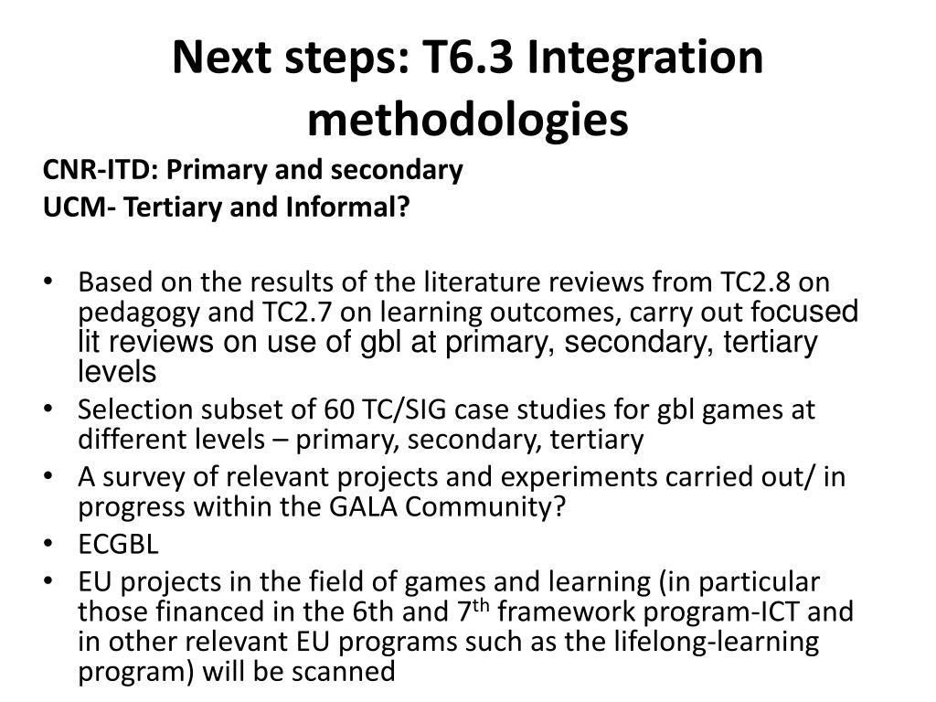 Next steps: T6.3 Integration methodologies CNR-ITD: Primary and secondary UCM- Tertiary and Informal? • Based on the results of the literature reviews from TC2.8 on pedagogy and TC2.7 on learning outcomes, carry out focused lit reviews on use of gbl at primary, secondary, tertiary levels • Selection subset of 60 TC/SIG case studies for gbl games at different levels – primary, secondary, tertiary • A survey of relevant projects and experiments carried out/ in progress within the GALA Community? • ECGBL • EU projects in the field of games and learning (in particular those financed in the 6th and 7th framework program-ICT and in other relevant EU programs such as the lifelong-learning program) will be scanned