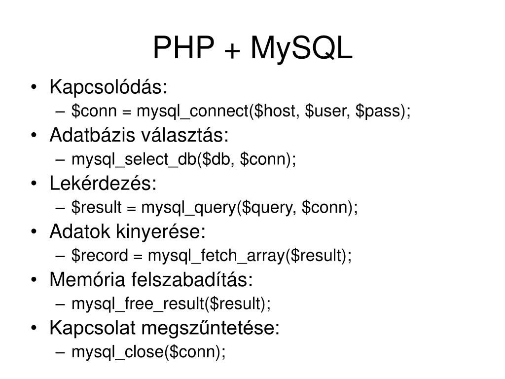 PHP + MySQL • Kapcsolódás: • $conn = mysql_connect($host, $user, $pass); • Adatbázis választás: • mysql_select_db($db, $conn); • Lekérdezés: • $result = mysql_query($query, $conn); • Adatok kinyerése: • $record = mysql_fetch_array($result); • Memória felszabadítás: • mysql_free_result($result); • Kapcsolat megszűntetése: • mysql_close($conn);