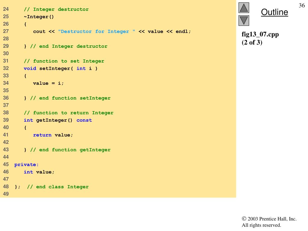 24 // Integer destructor 25 ~Integer() 26 { 27 cout << "Destructor for Integer " << value << endl; 28 29 } // end Integer destructor 30 31 // function to set Integer 32 void setInteger( int i ) 33 { 34 value = i; 35 36 } // end function setInteger 37 38 // function to return Integer 39 int getInteger() const 40 { 41 return value; 42 43 } // end function getInteger 44 45 private: 46 int value; 47 48 }; // end class Integer 49 fig13_07.cpp(2 of 3)