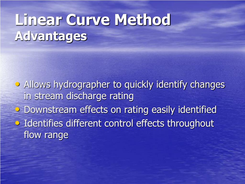 Linear Curve MethodAdvantages Allows hydrographer to quickly identify changes in stream discharge rating Downstream effects on rating easily identified Identifies different control effects throughout flow range