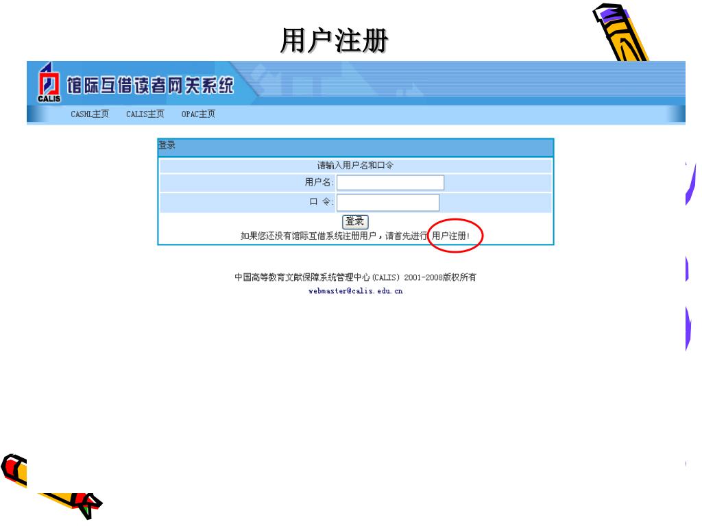 小结:使用CALIS文献传递服务 • 步骤一:成为CALIS系统的正式用户 • 登录文献传递主页,用本馆有效借书证的条码号注册,等待确认邮件。 • (1~2个工作日) • 步骤二:提交文献申请 • 步骤三:查看E-mail信箱(7个工作日后)