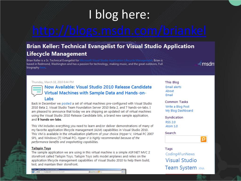 Building Robust, Maintainable Coded UI Tests with Visual Studio 2010. Brian Keller Sr. Technical Evangelist – Visual Studio ALM http://blogs.msdn.com/briankel. I work here…. …on this…. …and this. http:// bit.ly/ThisWeekC9. I blog here: http://blogs.msdn.com/briankel.