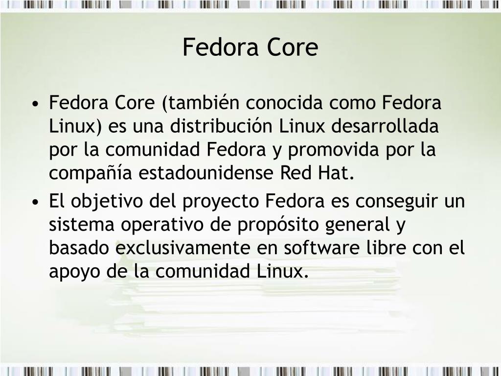 Fedora Core • Fedora Core (también conocida como Fedora Linux) es una distribución Linux desarrollada por la comunidad Fedora y promovida por la compañía estadounidense Red Hat. • El objetivo del proyecto Fedora es conseguir un sistema operativo de propósito general y basado exclusivamente en software libre con el apoyo de la comunidad Linux.