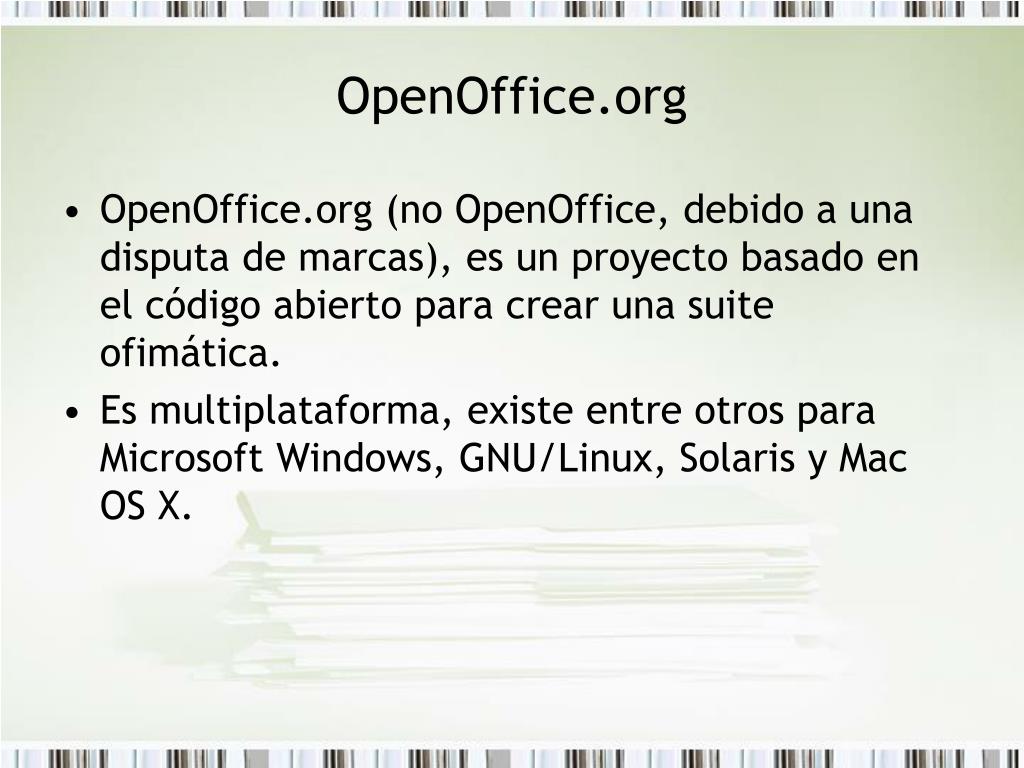OpenOffice.org • OpenOffice.org (no OpenOffice, debido a una disputa de marcas), es un proyecto basado en el código abierto para crear una suite ofimática. • Es multiplataforma, existe entre otros para Microsoft Windows, GNU/Linux, Solaris y Mac OS X.