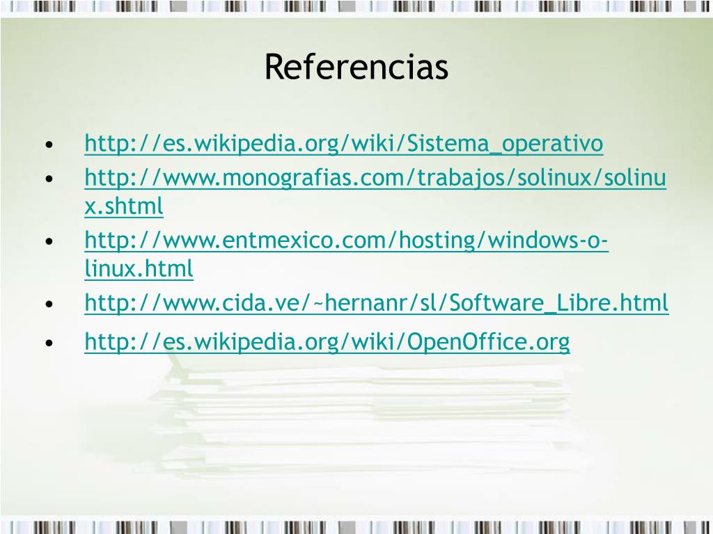 Referencias • http://es.wikipedia.org/wiki/Sistema_operativo • http://www.monografias.com/trabajos/solinux/solinux.shtml • http://www.entmexico.com/hosting/windows-o-linux.html • http://www.cida.ve/~hernanr/sl/Software_Libre.html • http://es.wikipedia.org/wiki/OpenOffice.org