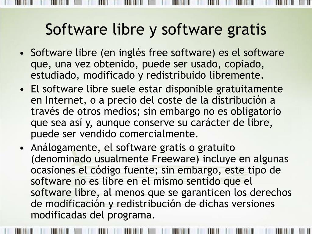 Software libre y software gratis • Software libre (en inglés free software) es el software que, una vez obtenido, puede ser usado, copiado, estudiado, modificado y redistribuido libremente. • El software libre suele estar disponible gratuitamente en Internet, o a precio del coste de la distribución a través de otros medios; sin embargo no es obligatorio que sea así y, aunque conserve su carácter de libre, puede ser vendido comercialmente. • Análogamente, el software gratis o gratuito (denominado usualmente Freeware) incluye en algunas ocasiones el código fuente; sin embargo, este tipo de software no es libre en el mismo sentido que el software libre, al menos que se garanticen los derechos de modificación y redistribución de dichas versiones modificadas del programa.