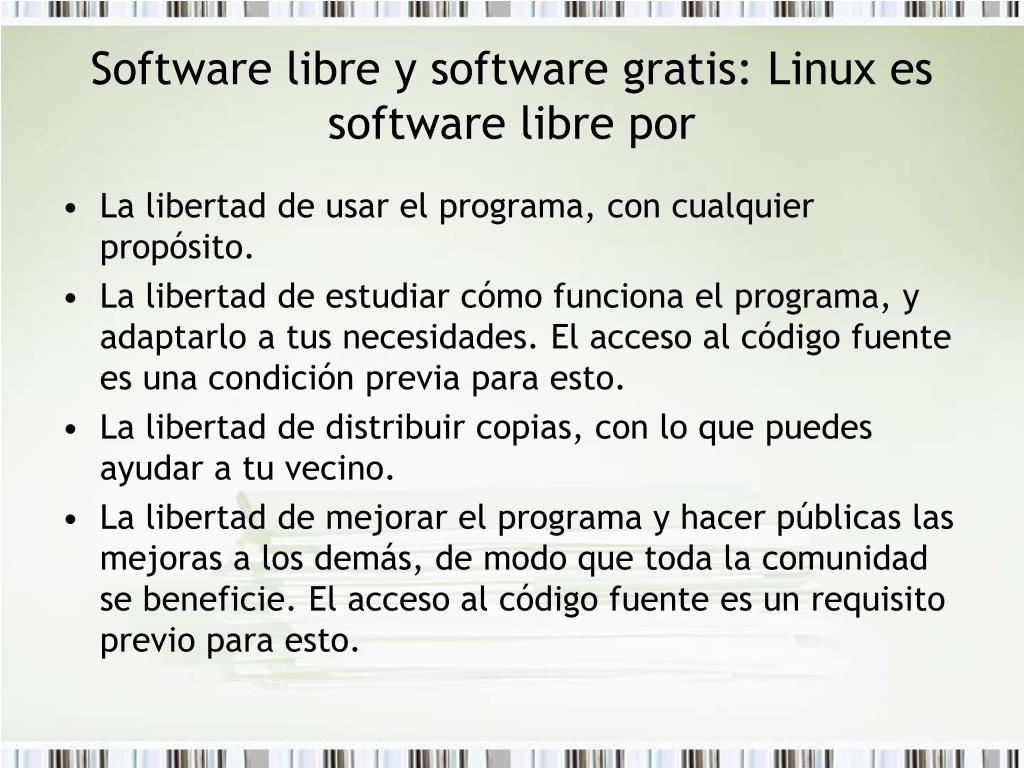 Software libre y software gratis: Linux es software libre por • La libertad de usar el programa, con cualquier propósito. • La libertad de estudiar cómo funciona el programa, y adaptarlo a tus necesidades. El acceso al código fuente es una condición previa para esto. • La libertad de distribuir copias, con lo que puedes ayudar a tu vecino. • La libertad de mejorar el programa y hacer públicas las mejoras a los demás, de modo que toda la comunidad se beneficie. El acceso al código fuente es un requisito previo para esto.