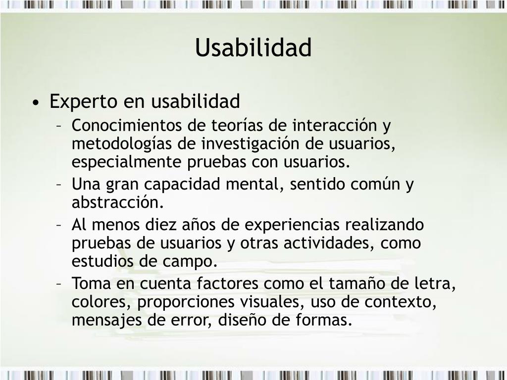Usabilidad • Experto en usabilidad • Conocimientos de teorías de interacción y metodologías de investigación de usuarios, especialmente pruebas con usuarios. • Una gran capacidad mental, sentido común y abstracción. • Al menos diez años de experiencias realizando pruebas de usuarios y otras actividades, como estudios de campo. • Toma en cuenta factores como el tamaño de letra, colores, proporciones visuales, uso de contexto, mensajes de error, diseño de formas.