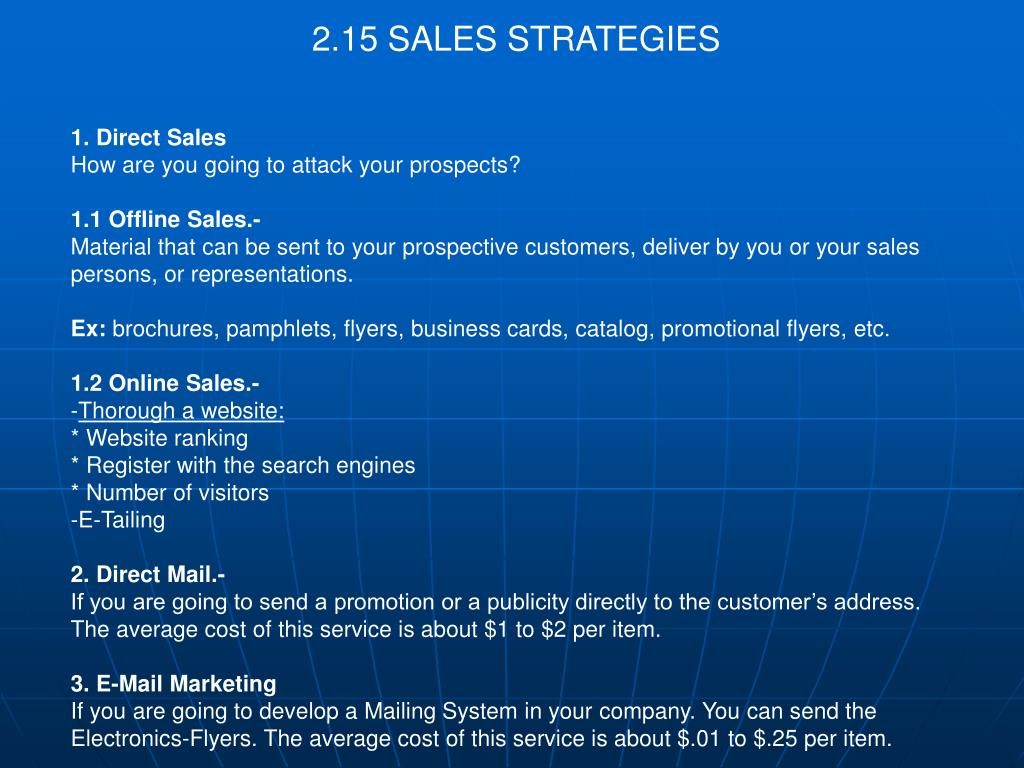 2.15 SALES STRATEGIES • 1. Direct Sales • How are you going to attack your prospects? • 1.1 Offline Sales.- • Material that can be sent to your prospective customers, deliver by you or your sales persons, or representations. • Ex: brochures, pamphlets, flyers, business cards, catalog, promotional flyers, etc. • 1.2 Online Sales.- • Thorough a website: • * Website ranking • * Register with the search engines • * Number of visitors • E-Tailing • 2. Direct Mail.- • If you are going to send a promotion or a publicity directly to the customer’s address. • The average cost of this service is about $1 to $2 per item. • 3. E-Mail Marketing • If you are going to develop a Mailing System in your company. You can send the Electronics-Flyers. The average cost of this service is about $.01 to $.25 per item.