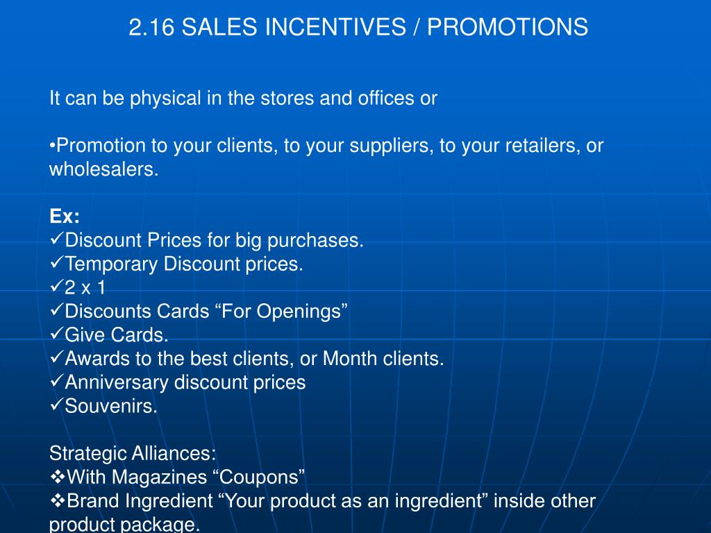 2.16 SALES INCENTIVES / PROMOTIONS • It can be physical in the stores and offices or • Promotion to your clients, to your suppliers, to your retailers, or wholesalers. • Ex: • Discount Prices for big purchases. • Temporary Discount prices. • 2 x 1 • Discounts Cards “For Openings” • Give Cards. • Awards to the best clients, or Month clients. • Anniversary discount prices • Souvenirs. Strategic Alliances: • With Magazines “Coupons” • Brand Ingredient “Your product as an ingredient” inside other product package.
