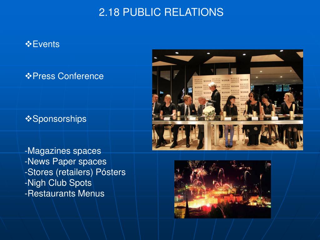 2.18 PUBLIC RELATIONS • Events • Press Conference • Sponsorships • Magazines spaces • News Paper spaces • Stores (retailers) Pósters • Nigh Club Spots • Restaurants Menus