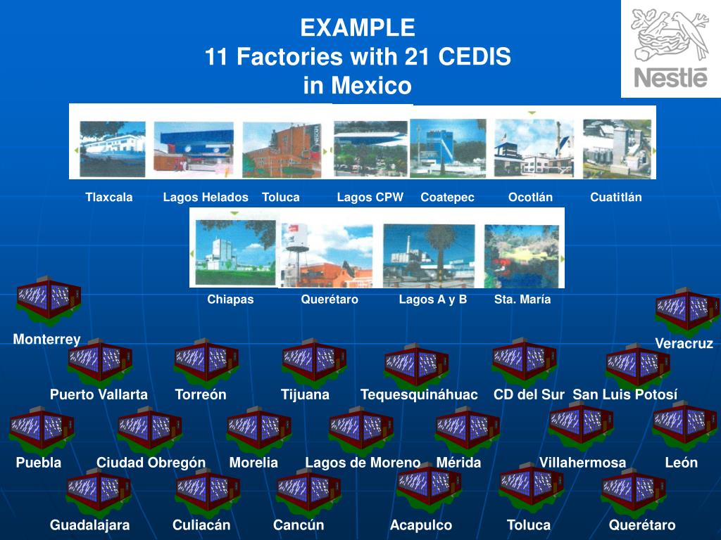 EXAMPLE 11 Factories with 21 CEDIS in Mexico Tlaxcala Lagos Helados Toluca Lagos CPW Coatepec Ocotlán Cuatitlán Chiapas Querétaro Lagos A y B Sta. María Monterrey Veracruz Puerto Vallarta Torreón Tijuana Tequesquináhuac CD del Sur San Luis Potosí Puebla Ciudad Obregón Morelia Lagos de Moreno Mérida Villahermosa León Guadalajara Culiacán Cancún Acapulco Toluca Querétaro