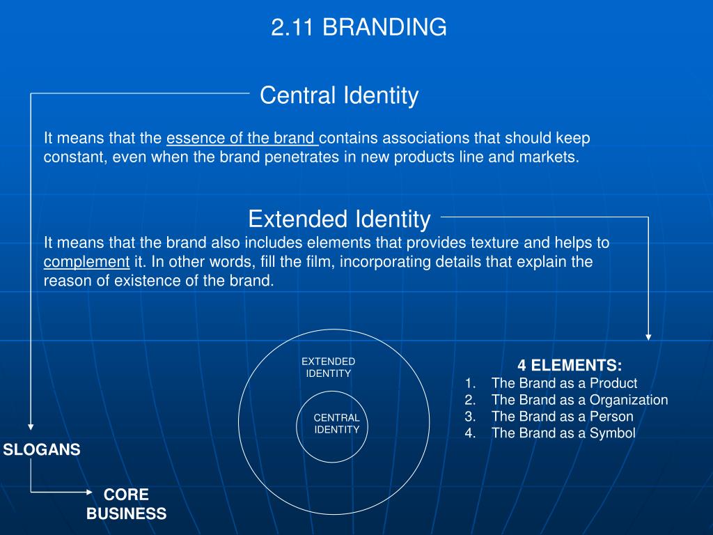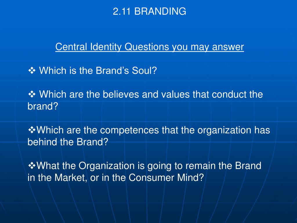 2.11 BRANDING • Central Identity Questions you may answer • Which is the Brand’s Soul? • Which are the believes and values that conduct the brand? • Which are the competences that the organization has behind the Brand? • What the Organization is going to remain the Brand in the Market, or in the Consumer Mind?