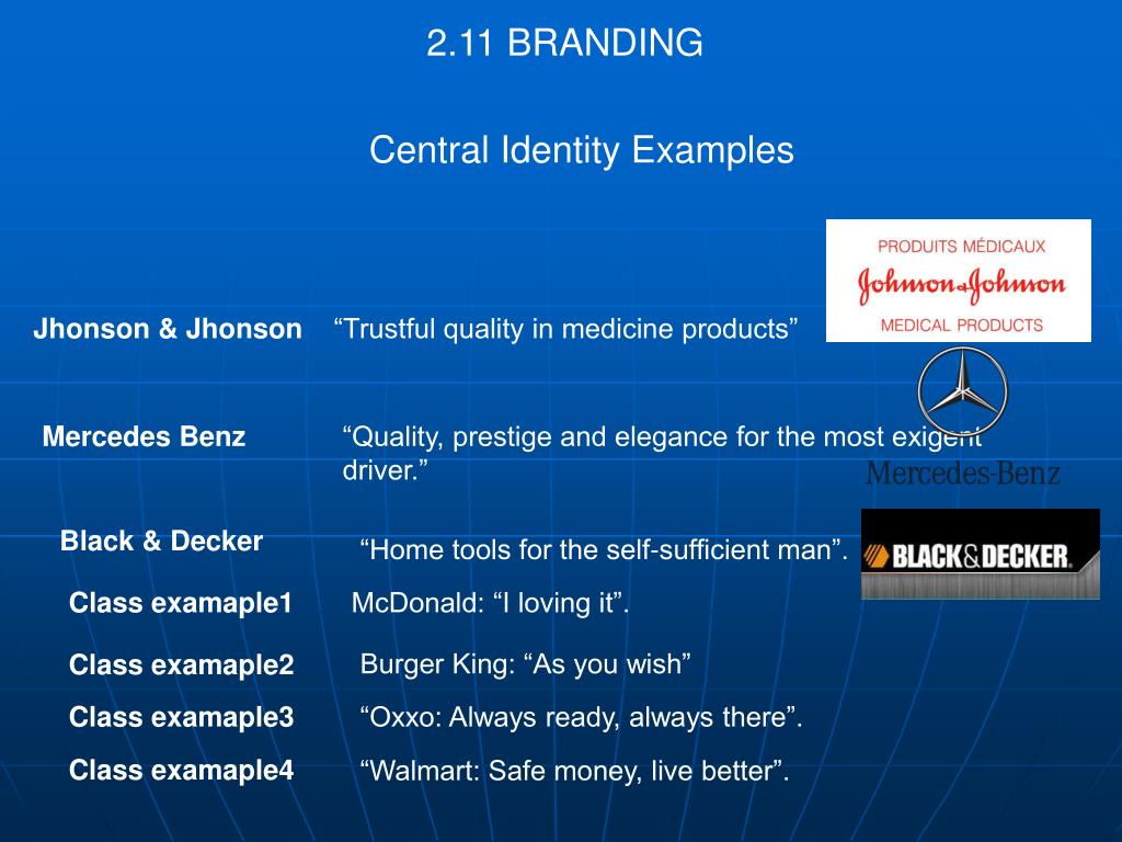 2.11 BRANDING Central Identity Examples Jhonson & Jhonson “Trustful quality in medicine products” Mercedes Benz “Quality, prestige and elegance for the most exigent driver.” Black & Decker “Home tools for the self-sufficient man”. Class examaple1 McDonald: “I loving it”. Burger King: “As you wish” Class examaple2 Class examaple3 “Oxxo: Always ready, always there”. Class examaple4 “Walmart: Safe money, live better”.
