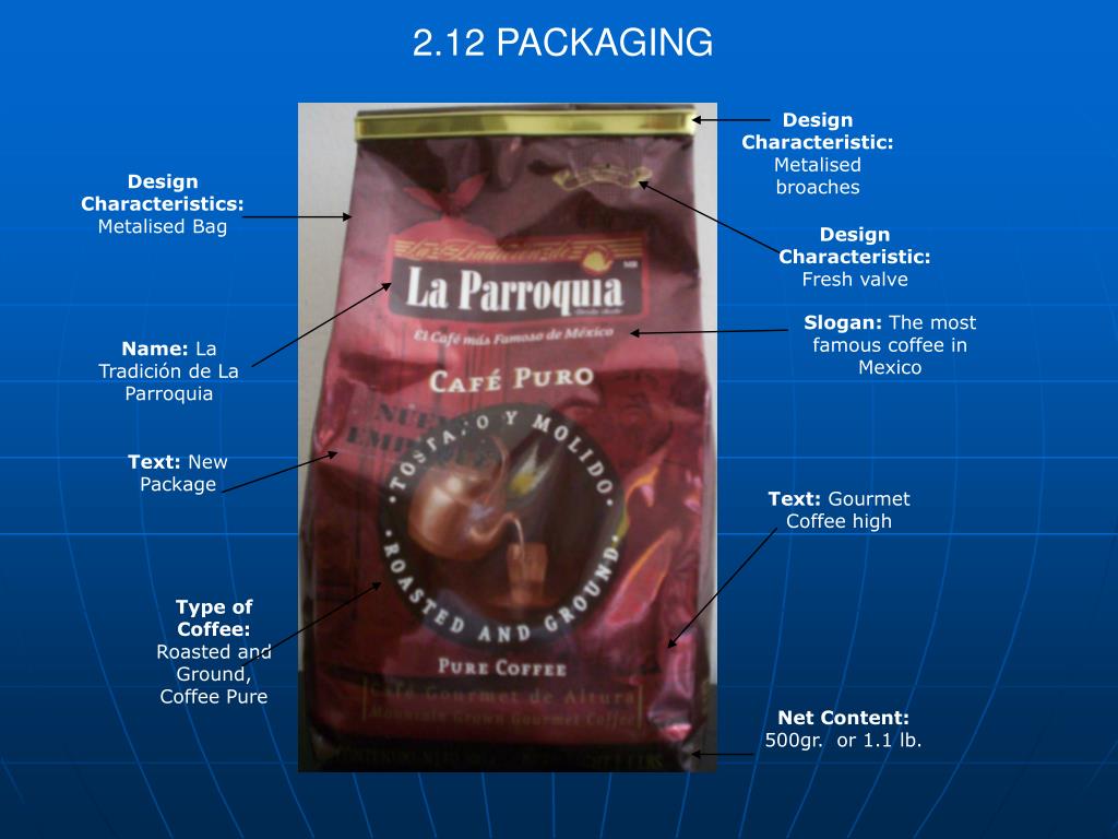 2.12 PACKAGING Design Characteristic: Metalised broaches Design Characteristics: Metalised Bag Design Characteristic: Fresh valve Slogan: The most famous coffee in Mexico Name: La Tradición de La Parroquia Text: New Package Text: Gourmet Coffee high Type of Coffee: Roasted and Ground, Coffee Pure Net Content: 500gr. or 1.1 lb.