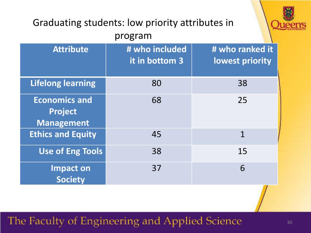 Self reported demonstration at program entry • Top five Grad Attributes where students reported a rating of 2 or 3 (yes or to a great degree) out of 3 • Individual and Team Work 88.73% • Communication Skills 78.17% • Professionalism 69.02% • Problem Analysis 61.26% • Investigation 60.56% Potential for students to perceive little value in learning activities directed toward developing these attributes