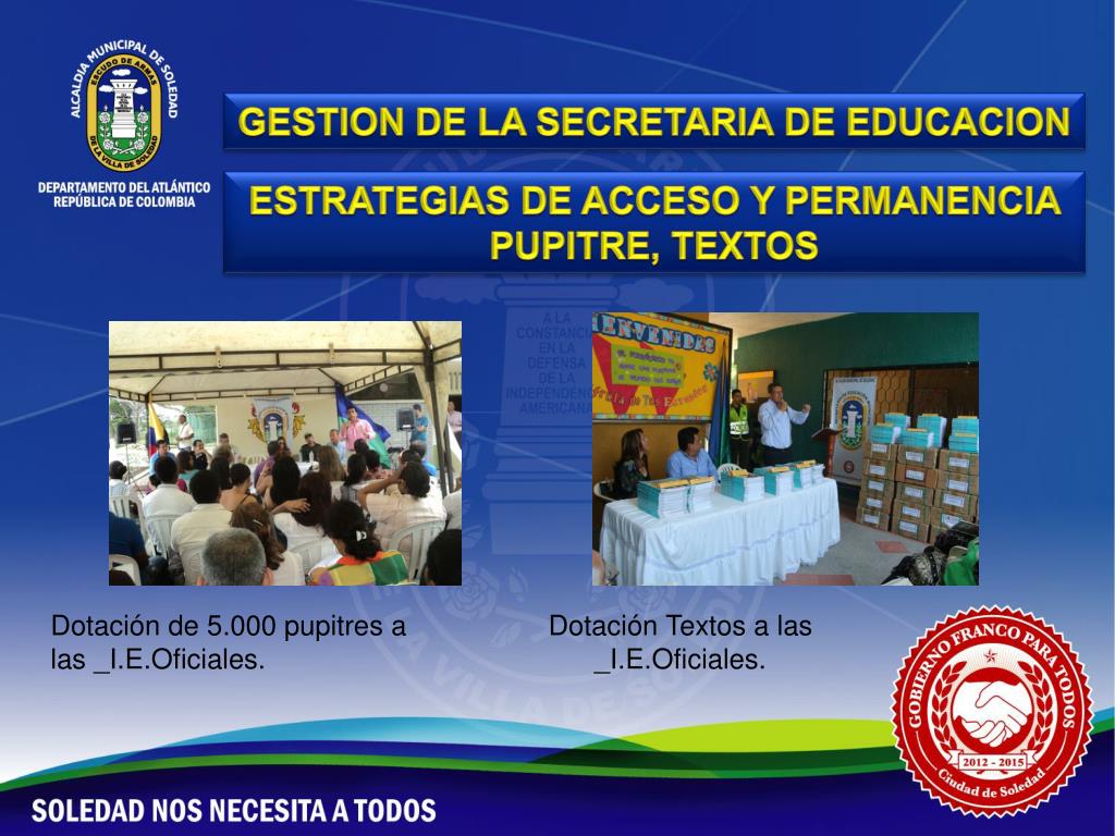 GESTION DE LA SECRETARIA DE EDUCACION ESTRATEGIAS DE ACCESO Y PERMANENCIA PUPITRE, TEXTOS Dotación de 5.000 pupitres a las _I.E.Oficiales. Dotación Textos a las _I.E.Oficiales.