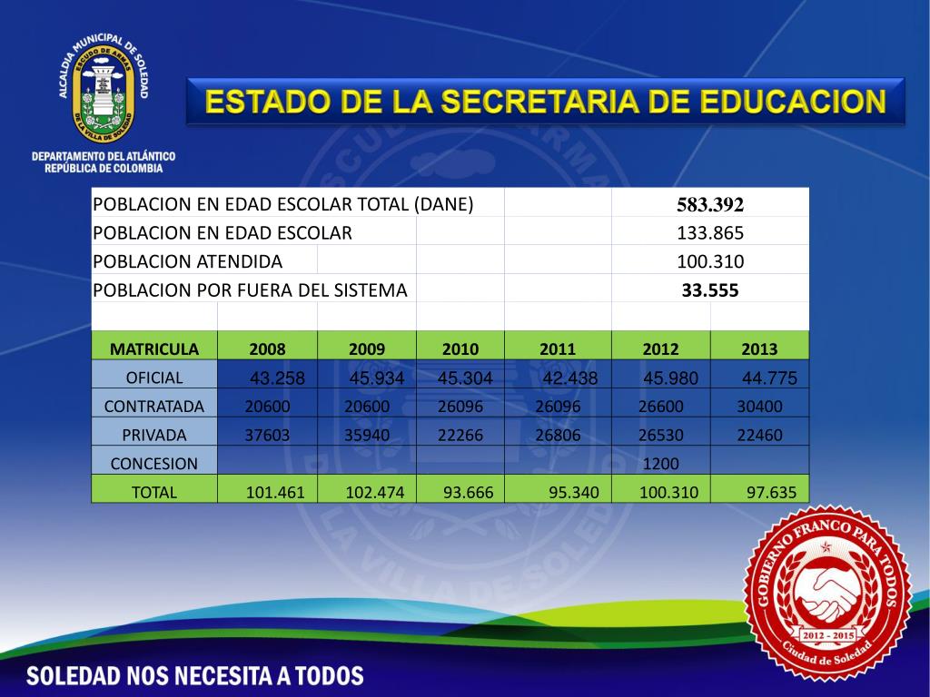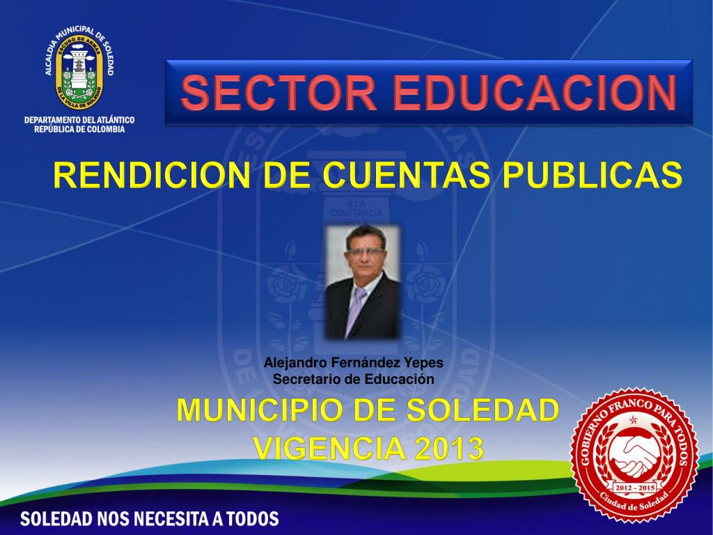 SECTOR EDUCACION RENDICION DE CUENTAS PUBLICAS Alejandro Fernández Yepes Secretario de Educación MUNICIPIO DE SOLEDAD VIGENCIA 2013